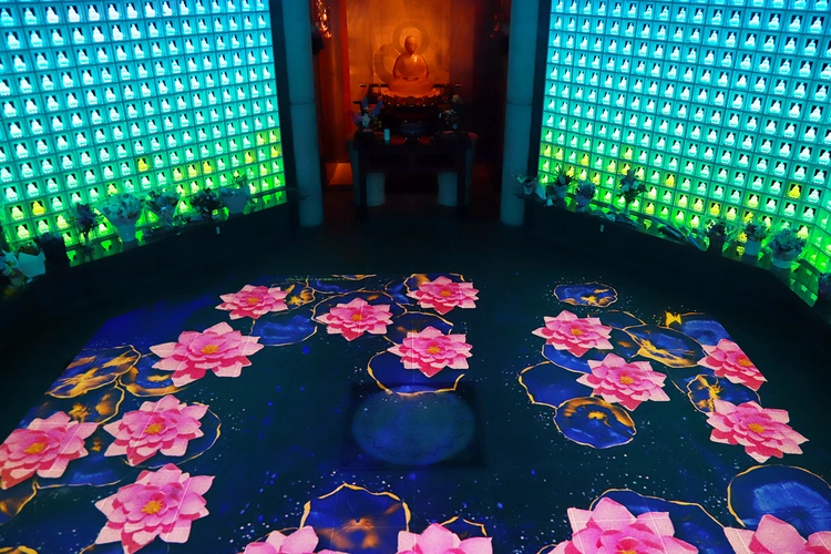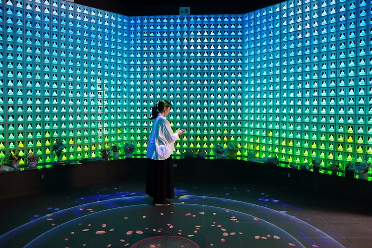 新宿琉璃殿では2046体のガラス製仏像がやさしく輝き、まるで極楽浄土の世界に足を踏み入れたかのような神秘的な空間が広がります。四季折々の風景が映し出されるプロジェクションマッピングが祈りの時間に彩りを添え、現代的で感動的な供養の場を実現。ICカードをかざすと自分だけの仏様が点灯する仕組みも、牛込の地で新しい参拝スタイルとして多くの方に親しまれています。