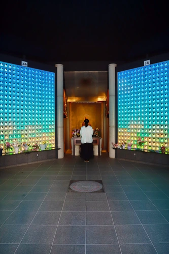 幸国寺内にある納骨堂、2046体の古代ガラスて作られた仏様が光り輝いていて厳かな雰囲気。お参りするときには、瑠璃殿の入り口にあるタッチパネルで名前を入力すると、ご自身の仏様の場所が光り輝き、点滅しているところでお参りする。