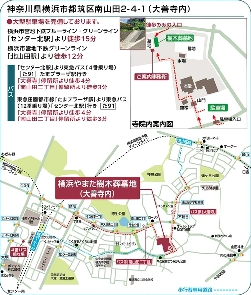 横浜やまた樹木葬墓地は横浜市都筑区南山田に位置し、センター北駅から徒歩15分、北山田駅からは徒歩12分と複数路線からアクセス可能です。たまプラーザ駅からもバスで通いやすく、大型駐車場も完備されているため、電車でもお車でもお参りしやすい環境が整っています。