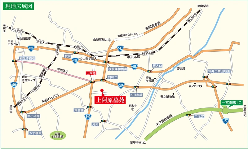 上阿原墓苑は甲府市上阿原町の市街地にあり、甲府バイパス「上阿原交差点」から車で約1分という抜群のアクセスを誇ります。駐車場が墓苑に隣接しているため、車から降りてすぐにお参りができ、お年寄りの方でも負担なく墓参りを続けられます。甲府市内の生活圏からアクセスしやすく、お線香や花を現地調達できる売店も併設されているため、手ぶらでお参りに来ることも可能です。